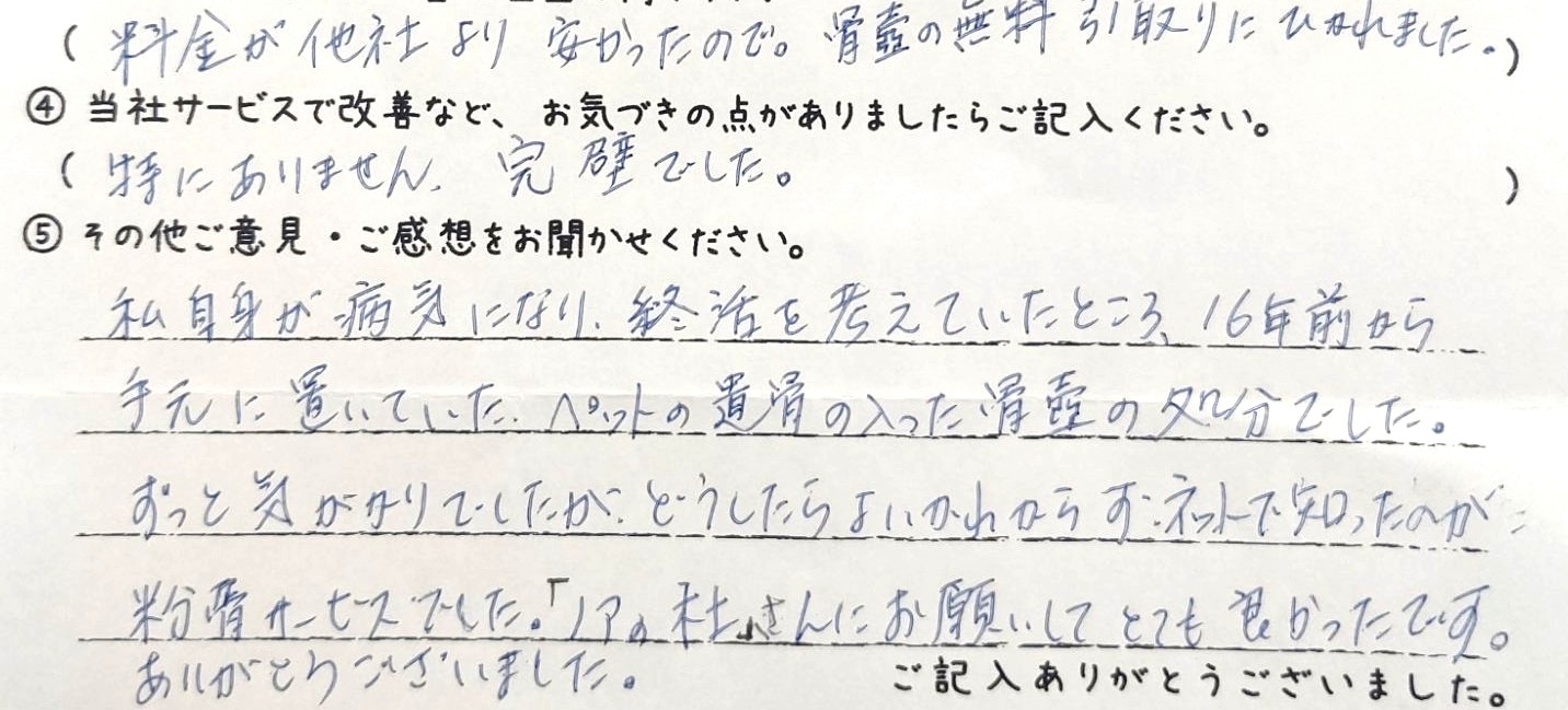 私自身が病気になり、終活を考えていたところ、16年前から手元に置いていた、ペットの遺骨の入った骨壺の処分でした。ずっと気がかりでしたが、どうしたらよいかわからず、ネットで知ったのが粉骨サービスでした。「ノアの杜」さんにお願いしてとても良かったです。ありがとうございました。