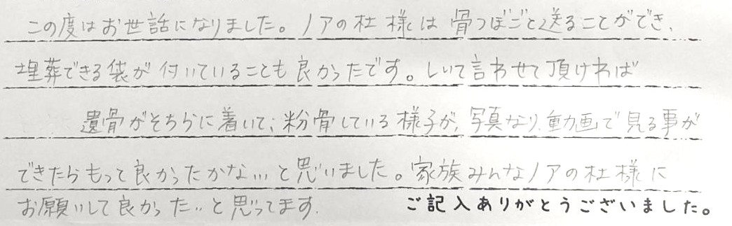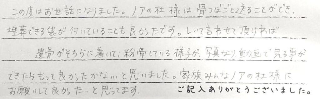 この度はお世話になりました。ノアの杜様には骨つぼごと送ることができ、埋葬できる袋が付いていることも良かったです。しいて言わせていただければ遺骨がそちらに着いて、粉骨している様子が、写真なり動画で見ることができたらもっと良かったかな、、と思いました。家族みんなノアの杜様にお願いしてよかった、と思っています。