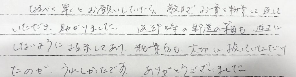 なるべく早くとお願いしていたら、数日でお骨を粉骨して返していただき助かりました。返却時の郵送の箱も逆さにしないように指示してあり粉骨も大切に扱っていただけたのがうれしかったです。ありがとうございました。