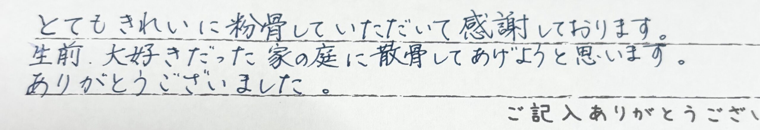 とてもきれいに粉骨していただいて感謝しております。生前大好きだった家の庭に散骨してあげようと思います。ありがとうございました。