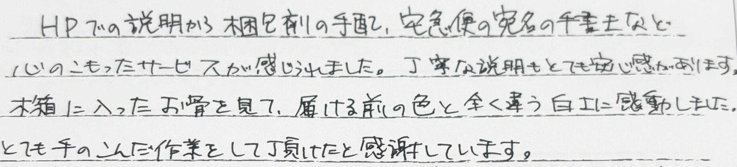 HPでの説明から梱包材の手配、宅急便の宛名の手書きなど心のこもったサービスが感じられました。丁寧な説明もとても安心感があります。木箱に入ったお骨を見て、届ける前の色と全く違う白さに感動しました。とても手のこんだ作業をして頂けたと感謝しています。