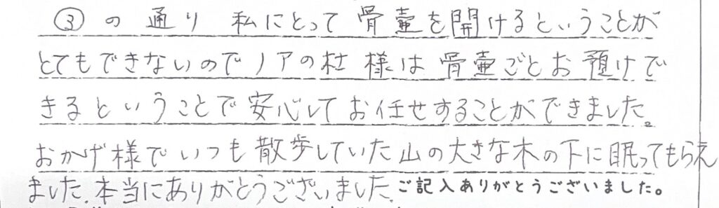 ③の通り私にとって骨壺を開けるということがとてもできないのでノアの杜様は骨壺ごとお預けできるということで安心してお任せすることができました。おかげ様でいつも散歩していた山の大きな木の下に眠ってもらえました。本当にありがとうございました。