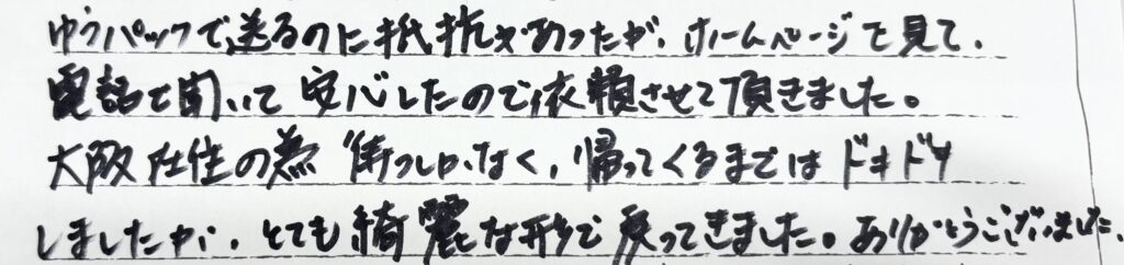 ゆうパックで送るのに抵抗があったがホームページを見て電話を聞いて安心したので依頼させて頂きました。大阪在住の為待つしかなく帰ってくるまではドキドキしましたが、とても綺麗な形で戻ってきました。ありがとうございました。