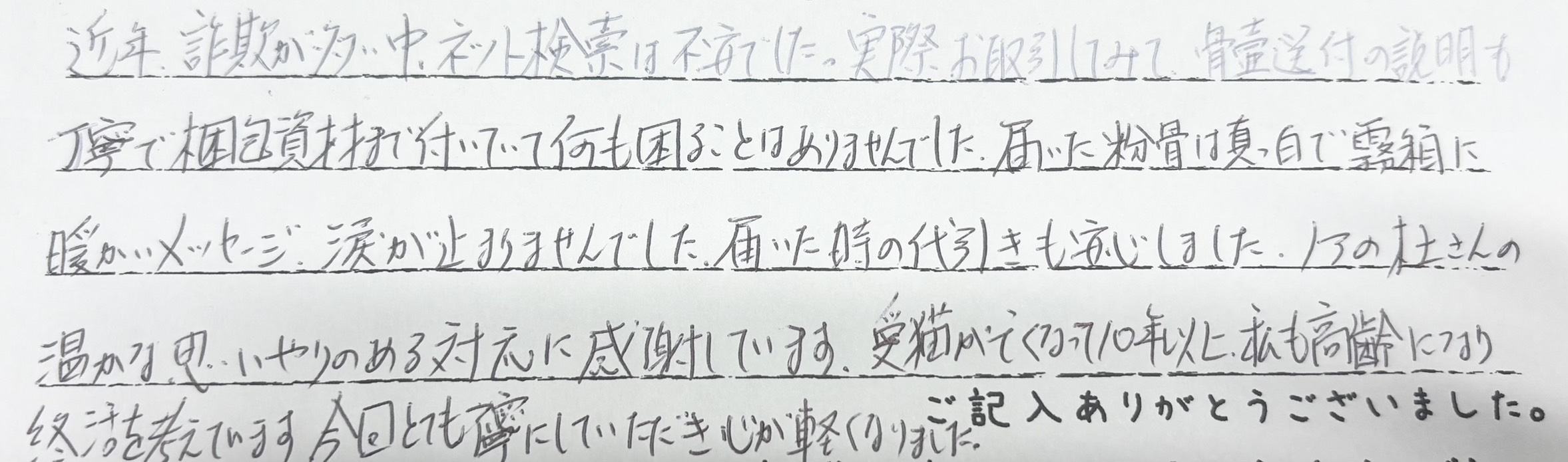 近年、詐欺が多い中ネット検索は不安でした。実際お取引してみて骨壺送付の説明も丁寧で梱包資材まで付いていて何も困ることはありませんでした。届いた粉骨は真っ白で桐箱に暖かいメッセージ、涙がとまりませんでした。届いたときの代引きも安心しました。ノアの杜さんの温かな思いやりのある対応に感謝しています。愛猫が亡くなって10年以上、私も高齢になり終活を考えています。今回とても丁寧にしていただき心が軽くなりました。