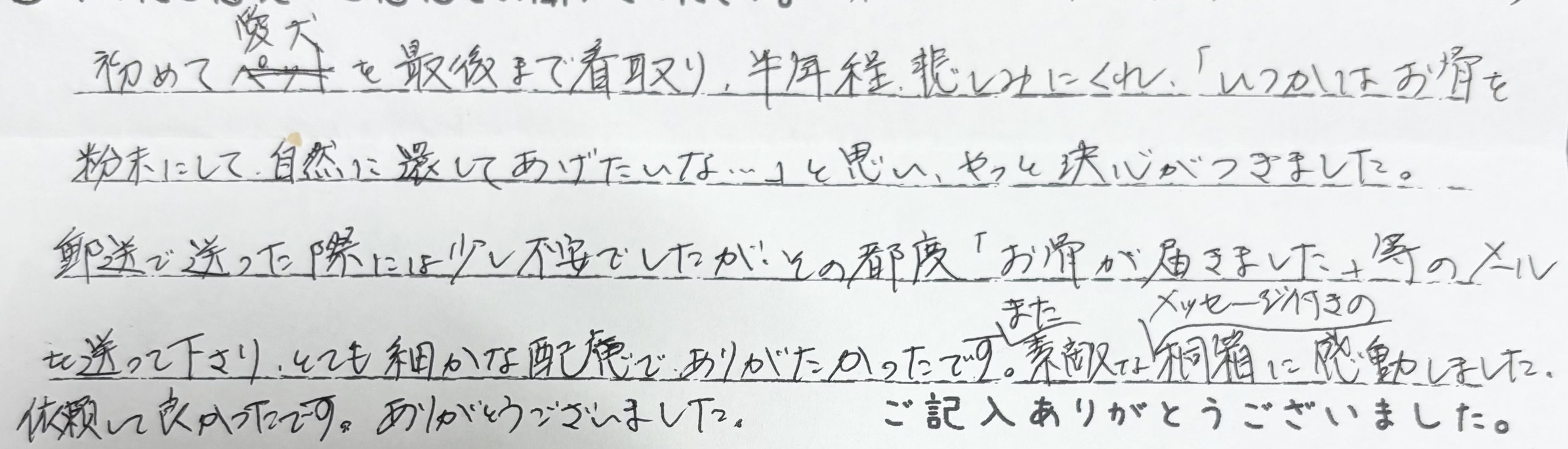 初めて愛犬を最後まで看取り、半年程悲しみにくれ「いつかはお骨を粉末にして自然に還してあげたいな…」と思い、やっと決心がつきました。郵送で送った際には少し不安でしたが、その都度「お骨が届きました」等のメールを送って下さり、とても細かな配慮でありがたかったです。また、素敵なメッセージ付きの桐箱に感動しました。依頼して良かったです。ありがとうございました。