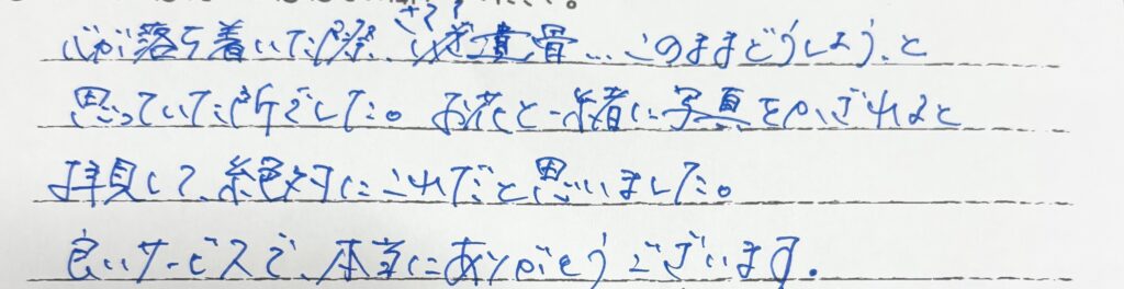 心が落ち着いた際、さて遺骨…このままどうしよう、と思っていた所でした。お花と一緒に写真をかざれると拝見して絶対にこれだと思いました。良いサービスで本当にありがとうございます。