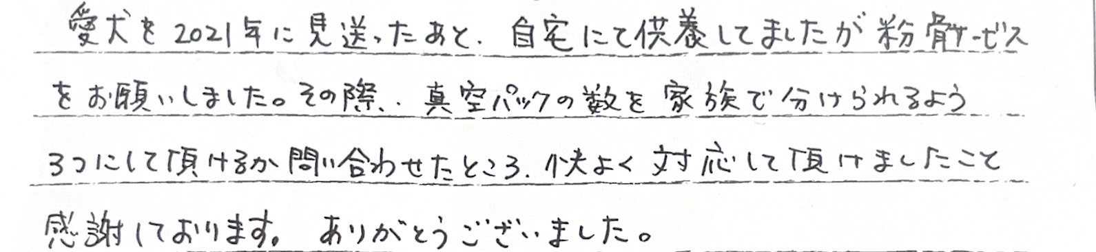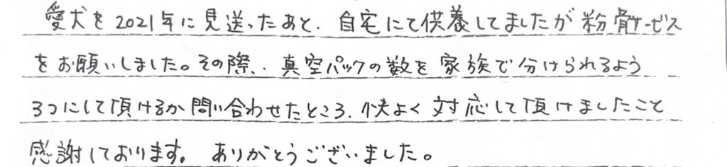 愛犬を2021年に見送ったあと、自宅にて供養してましたが粉骨サービスをお願いしました。その際、真空パックの数を家族で分けられるよう3つにして頂けるか問い合わせたところ快く対応して頂けましたこと感謝しております。ありがとうございました。