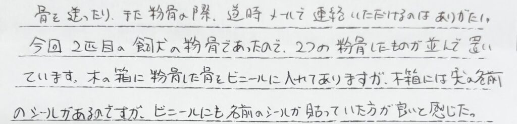 骨を送ったり、また粉骨の際、随時メールで連絡いただけるのはありがたい。今回2匹目の飼犬の粉骨であったので2つの粉骨したものが並んで置いています。木の箱に粉骨した骨をビニールに入れてありますが木箱には犬の名前のシールがあるのですがビニールにも名前のシールが貼っていた方が良いと感じた。