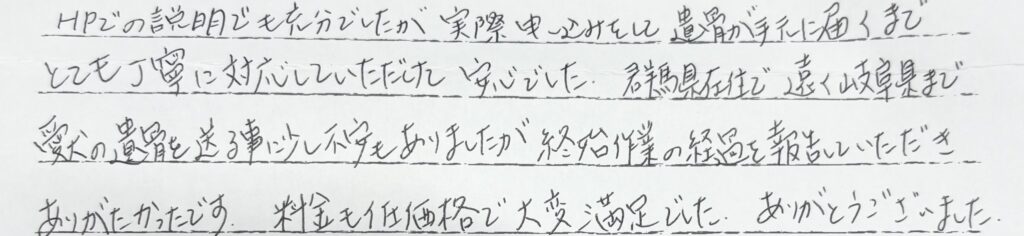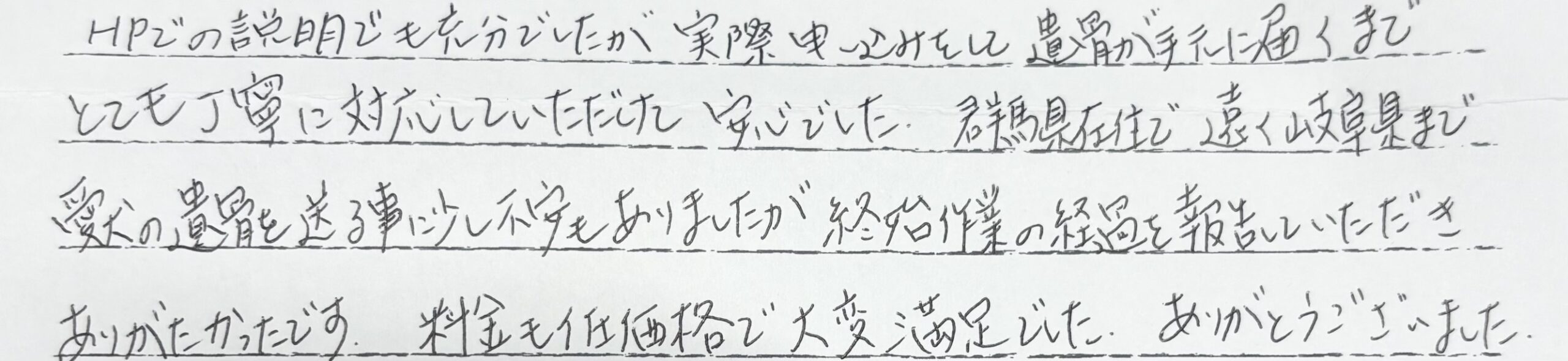 HPでの説明でも十分でしたが実際申し込みをして遺骨が手に届くまでとても丁寧に対応していただけて安心でした。群馬県在住で遠く岐阜県まで愛犬の遺骨を送る事に少し不安もありましたが終始作業の経過を報告していただきありがたかったです。料金も低価格で大変満足でした。ありがとうございました。